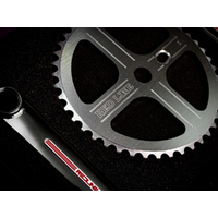 The iconic Redline Vintage 44-tooth aluminium Flight Sprocket is manufactured using CNC engraving to recreate the logos and surface design accurately and to scale. The spindle borehole diameter reverts to that of the original 1980s crank and pairs with the double dimple Redline Vintage Spindle. The sprocket drive window features the original “step’ interface and bolts securely into the sprocket drive boss mounted on the rear of the crank arm to ensure the assembly is rigid and efficient."